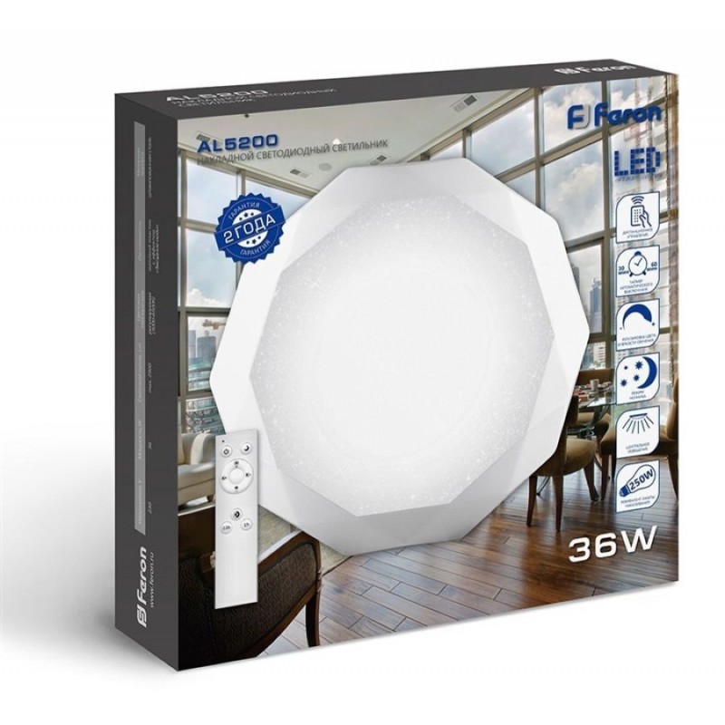 Потолочный светильник AL5200 29635 – товар от китайской компании Feron. Рассчитан на размещение в гостиной, спальне, кухне, офисе, предпочтительный стиль дизайна – современный. Примерная площадь освещения 7 кв. м при максимальной мощности в 36 Вт. Устанавливается на монтажную пластину. Основной материал изготовления – металл белого цвета. Абажур выполнен в белом цвете. Цоколь – LED, максимальная мощность лампочки – 36 Вт. Лучшая цена и быстрая доставка потолочного светильника 29635 в интернет-магазине Светлый Мир!