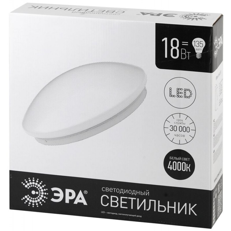 Потолочный светильник круглый светодиодный SPB-6-18-4K (F) относится к серии Классик без ДУ от российского бренда ЭРА, выполнен в стиле модерн и подойдет для размещения на потолке в гостиной, прихожей и коридоре, спальне, офисе. Материал арматуры - металл, цвет - белый. Светильник имеет 1 плафон; материал изготовления - акрил. Максимальная мощность лампы - 18W, напряжение 220V, световой поток 1400 lm, цветовая температура 4000K, срок службы составит не менее 30000 часов. Площадь освещения достигает 4 кв. м. Монтаж производится на пластину. Габариты изделия: высота - 10 см, диаметр - 33,7 см.