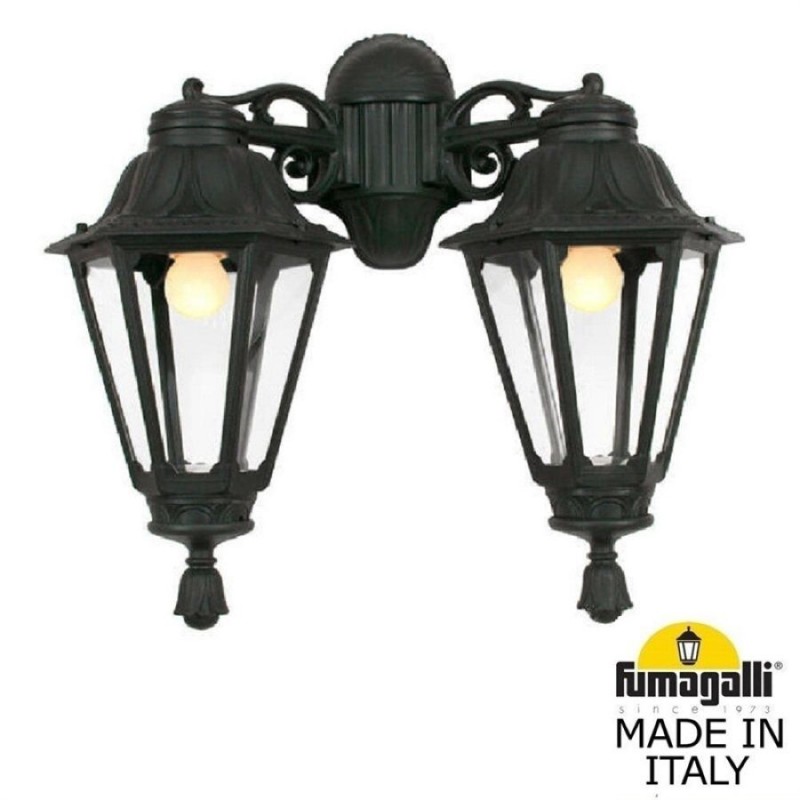 Светильники уличные настенные FUMAGALLI серии RUT, модель PORPORA/RUT DN. Консольный уличный светильник из 2-х фонарей RUT, на кронштейнах BISSO малого размера, для монтажа на стену. Тип монтажа консолей - "вниз". Используются для фасадного и архитектурного освещения в стиле "классика". Место установки уличных светильников - фасады, колонны и другие вертикальные поверхности исторических зданий, котеджей, загородных домов, церквей, а так же, другие места где требуется и возможна установка фонарей. Изготовлены в Италии, по уникальным технологиям "FUMAGALLI" из современного композитного полимера RESIN. Этот материал в 5 раз прочнее металла, не ржавеет, не окисляется, не выгорает на солнце, его не нужно красить. Все светильники пыле-влаго защищены по стандарту IP55 (Пылезащищенные, защита от водяных струй с любого направления). Рассеиватель выполнен из антивандального, не мутнеющего и не горючего PMMA (ПолиМетилМетаАкрилат). Срок службы светильника - не менее 20 лет. Температура использования от -60 до +90. В серии RUT есть фонари в настенном (BISSO/ RUT, OFIR/ RUT, MIRRA/ RUT, PORPORA/ RUT) подвесном (SICHEM/ RUT) и наземном исполнении (MINILOT/ RUT, MIZAR.R/ RUT, IAFAET.R/ RUT, ALOE.R/ RUT, ARTU/ RUT, GIGI/ RUT, RICU/ RUT, RICU/ISSO/ RUT 2L, NEBO/ RUT, NEBO OFIR/ RUT 2L, NEBO OFIR/ RUT 3L) со столбами разной высоты, с разным количеством и конфигурацией голов. Консоли настенных фонарей и кронштейны светильников на столбах освщения могут устанавливаться вверх/вниз. Столбы выше 150 см имеют в основе мощную стальную трубу с двойной оцинковкой. При заказе требуется выбрать цвет корпуса, цвет плафона и тип патрона. По стилю и дизайну серия уличных светильников RUT похожа на светильники малого размера серии ANNA и на светильники большого размера серии NOEMI. По размеру RUT относится к средним светильникам как серия CEFA, SALEM и GLOBE 300.